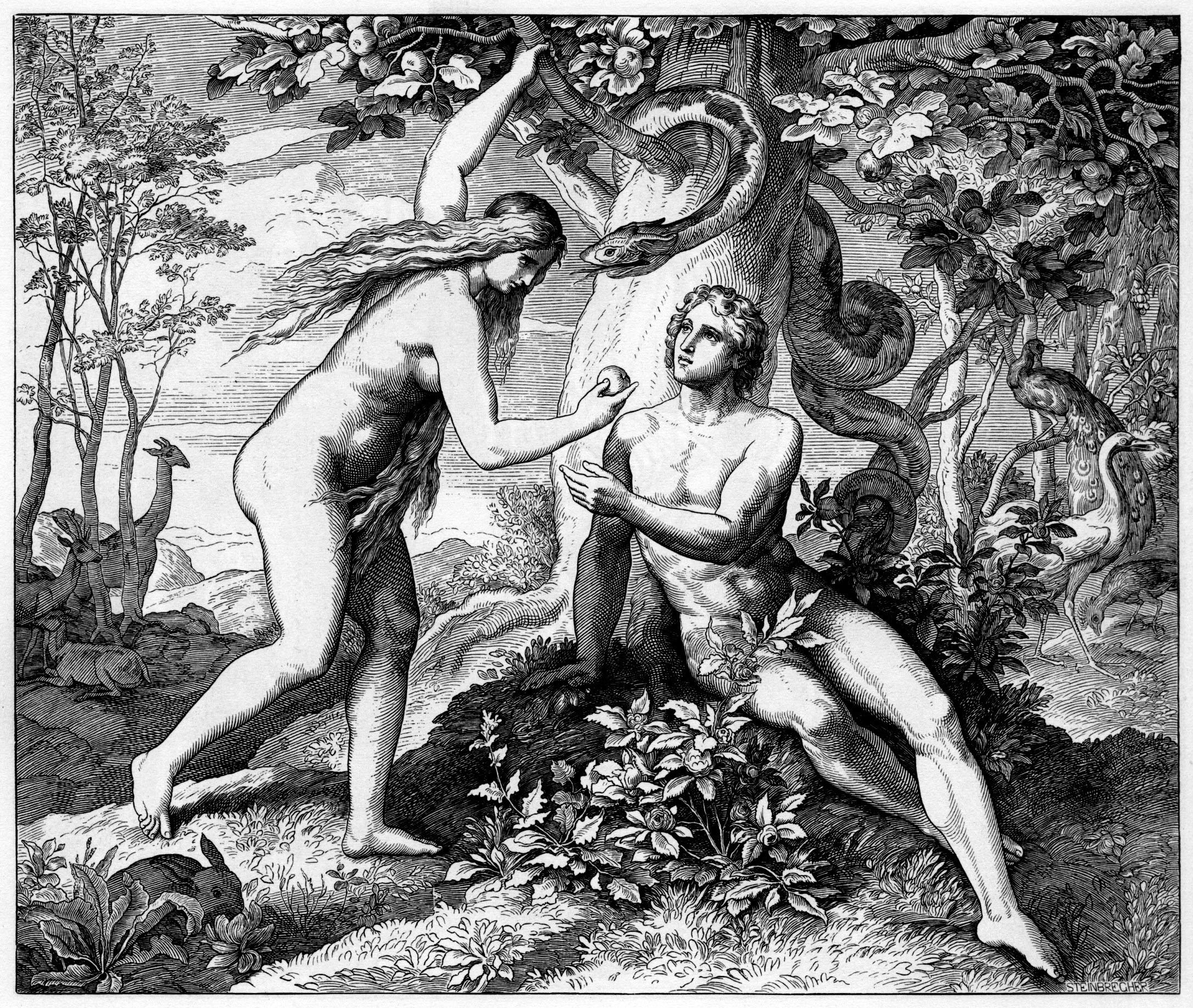 Изображение грехопадения Адама и Евы (иллюстрация Ю. Шнорр фон Карольсфельда) традиционно используется для наглядного представления начала человеческого греха и его последствий для всего рода человеческого.
