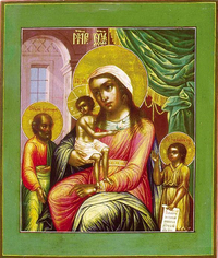 В начале XVIII столетия некий благочестивый живописец привез из Италии список с иконы, изображающей Святое Семейство. Этот образ он оставил в Москве у своего родственника, священника Троицкой, на Грязях, церкви. Впоследствии священник пожертвовал привезенный ему образ в свою приходскую церковь. Здесь икона была помещена на паперти, над входом в церковь. Через сорок лет Божия благодать прославила икону дивными знамениями. Предание гласит, что однажды на некую знатную женщину за короткий промежуток времени обрушилось сразу несколько несчастий — муж ее был оклеветан и отправлен в ссылку, имение отобрано в казну, а единственный любимый сын, опора и утешение несчастной женщины, во время войны попал в плен. Оказавшись в безвыходном положении, бедная женщина обратилась с горячей молитвой к Царице Небесной, прося Ее милостивого заступления. Владычица Небесная услышала слезные моления несчастной — однажды во сне женщина услышала голос, повелевающий ей отыскать икону Святого Семейства и помолиться перед ней. Долго искала скорбящая женщина образ по московским церквам и нашла его, наконец, на паперти Троицкой церкви на Покровке. Усердно помолившись Пресвятой Деве, она вскоре получила три радостных известия: муж ее был оправдан и возвращен из ссылки, сын освобожден из плена и имение возвращено из казны. Отсюда и пошло наименование иконы — «Трех Радостей». На иконе Божия Матерь изображена с Предвечным Младенцем на коленях. По правую Ее руку стоит старец Иосиф, а слева — Иоанн Предтеча, взирающие на Богомладенца с любовью. Помимо двух известных образов Божией Матери «Трех радостей» в церкви во имя Живоначальной Троицы, что на Грязех, в Москве чтимые списки с иконы пребывают в двух храмах: в честь Положения честной Ризы Пресвятой Богородицы во Влахерне и в домовой церкви Софринской бригады оперативного назначения МВД России. В 1918 году в Ризоположенскую церковь в Леонове перешло значительное число икон и церковной утвари из Свято-Михайловской церкви Гродненской епархии. Среди них туда была отправлена и икона «Трех Радостей». До реставрации она находилась у правого клироса главного алтаря, а в настоящее время пребывает в левом приделе перед клиросом. | |
