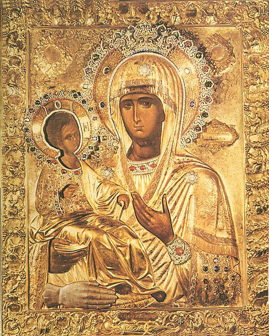 В VIII веке, во время иконоборчества, за ревностное почитание святых икон преподобный Иоанн Дамаскин († ок. 780; память 4 декабря) был оклеветан императором Львом III Исавром (717–740) перед Дамасским калифом в государственной измене. Калиф приказал отсечь кисть руки преподобного и повесить ее на рынке. К вечеру святой Иоанн, испросив у калифа отрубленную кисть, приложил ее к суставу и пал ниц перед иконой Божией Матери. Преподобный просил Владычицу исцелить руку, писавшую в защиту Православия. После долгой молитвы он задремал и увидел во сне, что Пречистая обращается к нему, обещая скорое исцеление. При этом Матерь Божия повелела ему без лени трудиться этой рукой. Пробудившись от сна, преподобный Иоанн увидел, что рука невредима. В благодарность за исцеление святой приложил к иконе сделанную из серебра руку, отчего икона и получила название "Троеручица". По преданию, преподобный Иоанн написал благодарственную песнь Матери Божией "О Тебе радуется, Благодатная, всякая тварь", которая является задостойником в литургии святого Василия Великого. Святой Иоанн Дамаскин принял иночество в Лавре преподобного Саввы Освященного и передал туда чудотворную икону. Лавра даровала икону "Троеручицы" в благословение святителю Савве, архиепископу Сербскому († 1237; память 12 января). Во время нашествия турок на Сербию христиане, желая сохранить икону, поручили ее попечению Самой Матери Божией. Они возложили ее на осла, который без погонщика пришел на Афон и остановился перед Хилендарским монастырем. Иноки поставили икону в соборном храме. Во время разногласий при выборе настоятеля Матерь Божия благоволила Сама принять настоятельство, и Ее святая икона заняла игуменское место в храме. С тех пор в Хилендарской обители избирается только наместник, а иноки, по монастырскому обычаю, получают от святой иконы благословение на все послушания. Список иконы XVII века является одной из основных реликвий Троянского монастыря в Болгарии. В России икона «Троеручицы» пользуется большим почитанием. В 1661 году из Хиландарского монастыря для патриарха Никона был прислан список этой иконы для его Новоиерусалимского монастыря. С него в 1716 году был снят другой список, с тех пор пребывающий в московском храме Успения в Гончарах (Болгарское подворье). С заступничеством этой святыни связывают то, что храм сей никогда, даже во времена наилютейших гонений на веру, не закрывался и сохранил все свои колокола. Ныне в храме перед этим образом ежепятнично читается акафист. В изразцовом киоте на наружной западной стене храма Успения в Гончарах помещен еще один список, и перед ликом Божией Матери «Троеручицы» здесь слышатся неустанные моления. Вместе с тем, приписывание на иконах Богородицы третьей руки как её собственной зачастую вызывало у людей естественное смущение. В рассуждении сего Святейший синод своим указом от 21 мая 1722 года постановил: повелевается о измышлениях от неискусных или злокозненных иконников, которые выдумали иконы противныя естеству, истории и самой истине, каковыя суть: образ мученика Христофора с песиею главою; образ Богородицы с тремя руками; <…> Чего для, впредь таких измышленных щудов на поругание святых первообразных лиц и во укорение святые церкви от инославных, не писать, а писать бы чинно и благообразно. Один из списков иконы Божией Матери «Троеручи