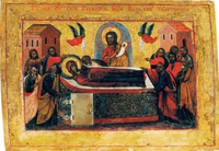 Киево-Печерская икона Успения Пресвятой Богородицы - одна из древнейших явленных икон в Русской Православной Церкви. Пресвятая Богородица вручила ее 4-м византийским зодчим, которые в 1073 году принесли икону преподобным Антонию и Феодосию Печерским. Зодчие пришли в пещеру к преподобным и спросили: "Где хотите вы начать церковь?" Святые ответили: "Идите, Господь назначит место". - "Как вы, предсказывая себе скорую смерть, не назначили еще места? - удивились зодчие. - А еще дали нам столько золота". Тогда преподобные призвали всю братию и стали расспрашивать греков, говоря: "Скажите нам истину, кто вас послал и как вы попали сюда?". Зодчие стали рассказывать: "Однажды, когда мы спали в своих домах, рано, на восходе солнца, пришли к каждому из нас благообразные юноши и сказали: "Зовет вас Царица во Влахерну". Мы пришли все в одно время и, расспросивши друг друга, узнали, что ту же речь Царицы слышал каждый из нас и одни и те же посланные были за всеми нами. Наконец, мы увидели Царицу со множеством воинов. Мы поклонились Ей, и Она сказала: "Я хочу построить Себе Церковь на Руси, в Киеве, и вот, велю вам это сделать. Возьмите золота на 3 года". - Мы же, поклонившись, спросили: "Госпожа, Царица! Ты посылаешь нас в чужую страну, к кому мы там придем?" - Она отвечала: "Я посылаю вас вот с ними, с Антонием и Феодосием". - Мы удивились: "Зачем же, Госпожа, Ты даешь нам золота на 3 года? Им и прикажи заботиться о нас, что нам есть и что пить, и нас одаришь, чем Сама знаешь". - Царица возразила: "Этот, Антоний, только благословит и отойдет от этого света в вечный покой. А этот, Феодосий, отойдет после него через 2 года. Итак, берите золота до избытка. А что до того, чтобы почтить вас, то никто не может сделать это так, как Я. Дам вам, чего и ухо не слышало, и глаз не видел и что на сердце человеку не всходило. Я Сама приду смотреть Церковь и буду в ней жить". - Она дала нам также мощи святых мучеников: Артемия, Полиевкта, Леонтия, Акакия, Арефы, Иакова, Феодора - и сказала: "Это положите в основание". - Мы взяли золота больше, чем нам нужно было, и Она сказала: "Выйдите на двор, посмотрите величину Церкви". - Мы вышли и увидели Церковь на воздухе. Вошедши опять к Царице, мы поклонились и сказали: "Госпожа Царица, какое имя Церкви?" - Она ответила: "Я хочу назвать ее Своим Именем". - Мы не смели спросить, как Ее Имя, но Она опять сказала Сама: "Богородицына будет Церковь". - И, давши нам эту икону, сказала: "Она будет в ней наместной". Мы поклонились Ей и пошли в свои дома, неся с собой икону, полученную из рук Царицы". Выслушав это, все прославили Бога, и преподобный Антоний сказал: "Дети, мы никогда не выходили из этого места. Звавшие вас благообразные юноши были святые Ангелы, а Царица во Влахерне - Сама Пресвятая Богородица. А что до нашего образа и данного как бы через нас золота, то Господь ведает, как Он изволил сотворить это со Своими рабами. Благословен приход ваш, добрую спутницу вы имеете, честную икону Госпожи". Три дня молился преподобный Антоний, чтобы Господь Сам указал ему место для церкви. После первой ночи по всей земле была роса, а на святом месте сухо. На другое утро по всей земле было сухо, а на святом месте роса. На третье утро, помолившись, благословили место и измерили золотым поясом ширину и длину церкви. (Этот пояс еще давно принес варяг Шимон, которому было видение о постройке церкви.) Огонь, спадший с не