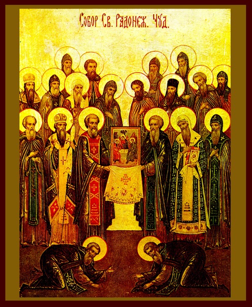 Конда́к, гла́с 8: Прииди́те, вси́ концы́ оте́чества на́шего, просла́вим святы́й ли́к уго́дников Ра́донежских, я́ко зве́зды, украси́вших не́бо церко́вное по́двиги земна́го жи́тельства, те́х бо предста́тельством те́плым ко Го́споду мно́гия на́м ми́лости Его́ низпосыла́ются, бе́дствия отгоня́ются и злы́я стра́сти укроща́ются. И́хже всесвяту́ю па́мять ны́не пра́зднующе, та́ко возопии́м: ра́дуйтеся, Се́ргие и Ни́коне и вси́ Ра́донежстии чудотво́рцы, усе́рднии служи́телие Живонача́льныя Тро́ицы. И́кос: Мирску́ю че́сть и сла́ву презре́вше, еди́ному Христу́ вожделе́ли есте́ порабо́тати, преподо́бнии отцы́ на́ши Се́ргие, Ни́коне и вси́ святи́и, в земли́ Ра́донежстей и о́крест ея́ просия́вшии, зде́ досто́йно и пра́ведно Живонача́льней Тро́ице послужи́ли есте́. Те́мже и всели́ся в ва́с Ду́х Пресвяты́й и умудри́ позна́нием пачеесте́ственным, наста́вите у́бо на́с и́стинней ве́ре и житию́, да сподо́бимся неосужде́нно призыва́ти Тро́ицу Единосу́щную и Неразде́льную. Те́мже, ублажа́юще ны́не ва́шу честну́ю па́мять, непреста́нно зове́м: ра́дуйтеся, отцы́ пресла́внии, учи́телие на́ши и служи́телие неотсту́пнии Святы́я Тро́ицы.