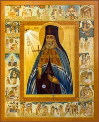 Пе́снь 8. Ирмо́с: Безнача́льнаго Царя́ Сла́вы, Его́же трепе́щут небе́сныя си́лы, по́йте, свяще́нницы, лю́дие, превозноси́те во вся́ ве́ки. Широ́кий пу́ть, вводя́щий в па́губу, презре́л еси́, преподо́бне, и те́сными враты́ вше́л еси́ в небе́сное Ца́рствие. Отону́дуже призира́я вы́ну на призыва́ющих тя́ с ве́рою, укрепи́ у́бо и на́с понести́ благо́е и ле́гкое и́го Креста́, да вни́дем в поко́й Бо́га благослове́ннаго. Ангелоподо́бным житие́м на земли́, обре́л еси́ благода́ть исцеле́ний, и яви́лся еси́ вои́стинну а́нгел храни́тель па́ствы твоея́, бо́дрственно утвержда́я ю́ в ве́ре многоразли́чными твои́ми чудотворе́нии, и соблюда́я в чи́стом испове́дании отце́в Бо́га благослове́ннаго. Христо́во благоуха́ние яви́лся еси́, о́тче, в спаса́емых тобо́ю от неду́гов душе́вных же и теле́сных; те́мже обита́тели гра́да тобо́ю избра́ннаго, прославля́юще святу́ю па́мять твою́, благословля́ют просла́вившаго тя́, отце́в Бо́га благослове́ннаго. Богоро́дичен: Не́сть на́ша бра́нь ко пло́ти и кро́ви, но к нача́лом, и ко власте́м, и к миродержи́телем тьмы́ ве́ка сего́, к духово́м зло́бы поднебе́сным; над ни́миже покажи́ ны́, Влады́чице, победи́тели, я́ко да по о́бразу непоро́чнаго па́стыря возмо́жем вся́ стре́лы лука́ваго разжже́нныя угаси́ти.