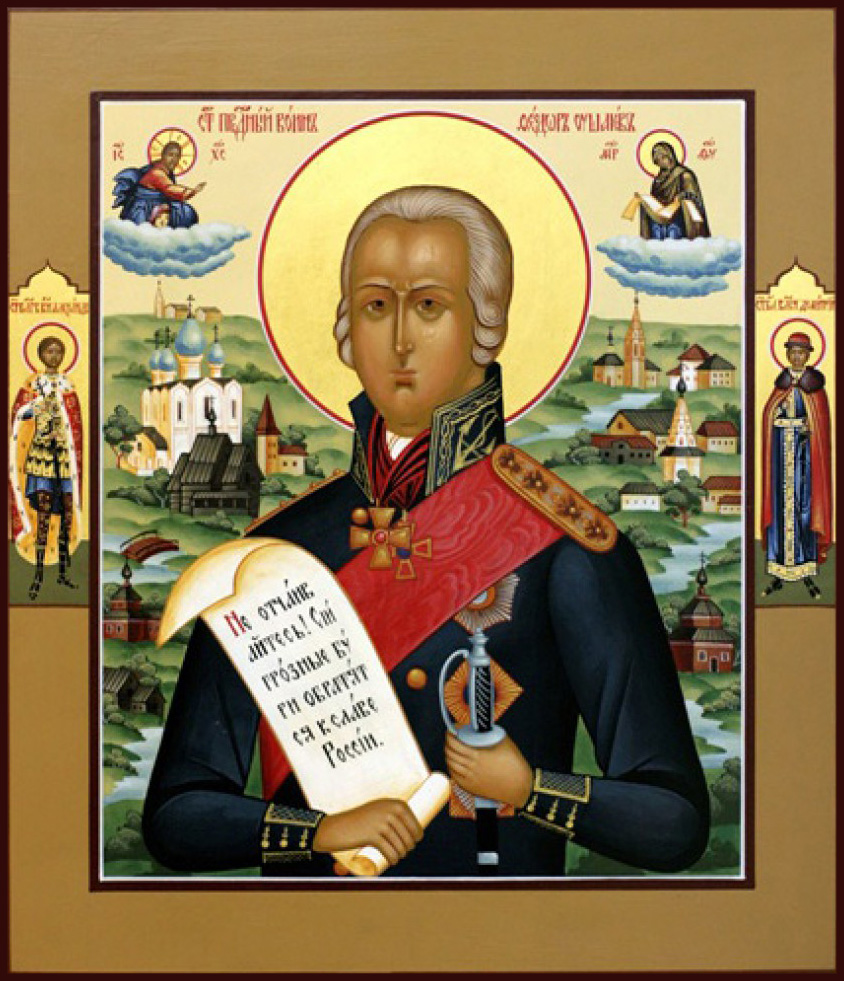 Конда́к, гла́с 2: Архистрати́же росси́йский, служи́телю наро́да Бо́жияго, ни́щих и угнете́нных свободи́телю, нечести́вых наказа́телю, поле́знаго на́м проси́ и ве́лия ми́лости, я́ко спобо́рник на́ш, пра́ведне Фео́доре. И́кос: Всечестну́ю па́мять почти́м уго́дника Христо́ва, вели́каго Фео́дора, хра́браго во́ина на сопоста́ты и ко́рмчаго благоути́шна, и ра́достными глаго́лы от се́рдца воззове́м к нему́, си́це вопию́ще: ра́дуйся, дела́ блага́я со тща́нием твори́вый; ра́дуйся, упра́вителю му́дрый и терпели́вый. Ра́дуйся, врачу́ усе́рдный и ми́лостивый; ра́дуйся, моли́твенниче те́плый и неутоми́мый. Ра́дуйся, воево́до пра́ведный и непобеди́мый; ра́дуйся, ра́бе Бо́жий, кро́ткий и человеколюби́вый. Ра́дуйся, враги́ злочести́выя смиря́яй и устраша́яй; ра́дуйся, и ны́не со А́нгелы и все́ми святы́ми за ны́ моля́йся. Ра́дуйся, во́ине Фео́доре, архистрати́же держа́вы Росси́йския.