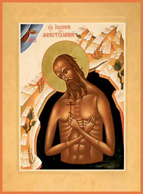 Пе́снь 6. Ирмо́с: Бе́здна после́дняя грехо́в обы́де мя́, и исчеза́ет ду́х мо́й; но простры́й, Влады́ко, высо́кую Твою́ мы́шцу, я́ко Петра́, мя́, Упра́вителю, спаси́. Бе́здна после́дняя отве́рзе горта́нь, нечи́стый во зми́я преобрази́выйся диа́вол воспе́нися, пламеноно́сными дыша́ зия́нии, хотя́ше поглоти́ти тя́, но ты́, о́тче, бы́л еси́ а́ки сто́лп недви́жимь, поя́: Бо́же мо́й, Упра́вителю, мя́ спаси́. На ка́мени тве́рдыя ве́ры стоя́, преподо́бне, щито́м наде́жды покры́лся еси́, и, бу́рю злоко́зненнаго врага́ ни во что́ же вмени́в, на главу́ его́ обрати́л еси́, и, в горта́ни того́ сы́й, не устраши́лся еси́, зовы́й ко Христу́: Упра́вителю, мя́ спаси́. Ки́т мы́сленный главу́ твою́, блаже́нне, в горта́нь сво́й вложи́, и опали́шася тебе́ власи́, но не опали́ся малоду́шием се́рдце твое́, о́тче, и́мже взыва́л еси́. И Госпо́дь услы́ша тя́, я́ко До́бр Ко́рмчий, любоприима́тельне спаса́я. Моли́тва твоя́, Иоа́нне, бы́сть стре́лы мо́лниины на сопроти́внаго си́лу, ре́кл бо еси́: Бо́же мо́й, вску́ю мя́ еси́ оста́вил? И а́бие исчезе́ льсти́вый я́звен и ктому́ не прибли́жися уже́ к тебе́, Све́том Боже́ственным прогна́н. Богоро́дичен: Стре́лы мы́сленнаго супоста́та страстьми́ ура́ниша ми́ се́рдце, те́м от го́рести души́ моея́ к тебе́ вопию́, Чи́стая: исто́ргни ты́я руко́ю Твое́ю, я́ко ро́ждшая Христа́, Цели́теля моего́.
