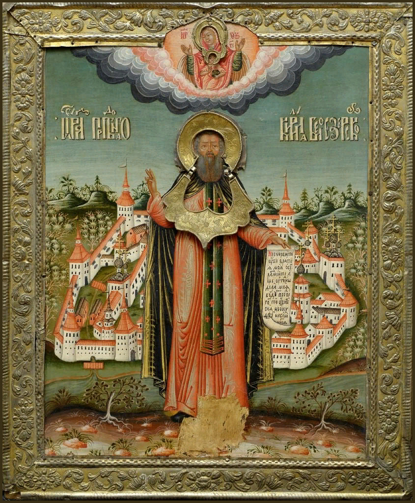 Пе́снь 1. Ирмо́с: Во́ду проше́д, я́ко су́шу, и еги́петскаго зла́ избежа́в, изра́ильтянин вопия́ше: Изба́вителю и Бо́гу на́шему пои́м. Я́ко вели́ко вои́стинну дерзнове́ние стяжа́в, преподо́бне, к Бо́гу, сбытию́ зри́тель сподо́бился еси́ бы́ти и непло́дная ложесна́ многопло́дна моли́твами твои́ми показа́л еси́. На воде́ поко́я и на зла́це воздержа́ния, о́тче, учени́к твои́х стада́ му́дре упа́сл еси́ и, ны́не с на́ми неви́димо водворя́яся, моли́ о чту́щих па́мять твою́. У́м тво́й к Бо́гу любо́вию впери́в, тле́нными нетле́нная искупи́л еси́. Те́мже вся́ка душа́, спаса́ема тобо́ю, тя́ прославля́ет. Богоро́дичен: Ма́нием вся́ Содержа́й из Тебе́ па́че сло́ва ражда́ется, Ма́ти Чи́стая, преподо́бныя венча́вый, ве́рно Тебе́ сла́вящия, Ма́терь Бо́жию.