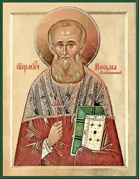 Пе́снь 8. Ирмо́с: О́троки благочести́выя в пещи́ Рождество́ Богоро́дичо спасло́ е́сть, тогда́ у́бо образу́емое, ны́не же де́йствуемое, вселе́нную всю́ воздвиза́ет пе́ти Тебе́: Го́спода по́йте дела́ и превозноси́те Его́ во вся́ ве́ки. Кла́сы спе́лыя ру́це твои́ пожина́ша, егда́ зе́млю, от нея́же я́ко вся́к челове́к изы́де, возде́ловаше, и се́ я́ко кла́с златы́й душа́ твоя́ восхище́на бы́сть в жи́тницу Христо́ву, и я́ко хле́бное приноше́ние на алта́рь возложи́ся. Ра́дость печа́ли насле́дует в путе́х непоро́чных, и весе́лия де́нь но́щи обстоя́ний и тя́гот, та́же и ско́рби и ра́ны полу́нощи жития́ твоего́, о́тче Космо́, дне́м несконча́емым преидо́ша в оби́телех Све́та. А́ще и подвиго́шася а́довы врата́ на Це́рковь Христо́ву, мня́ще вотще́ в земли́ на́шей потреби́ти Ю́, не поколеба́шеся до́блий Косма́ иере́й от Ка́мене Ве́ры, и утверди́ ны вопи́ти: отце́в и на́ш Бо́же, благослове́н еси́. Богоро́дичен: Ше́дше, наро́ди, Горе́ святе́й Бо́жией поклони́мся, от Нея́же Спасе́ние на́м нерукосе́чно изы́де и ми́р Собо́ю испо́лни, Христо́с Бо́г, отце́в и на́ш Бо́же, благослове́н еси́.