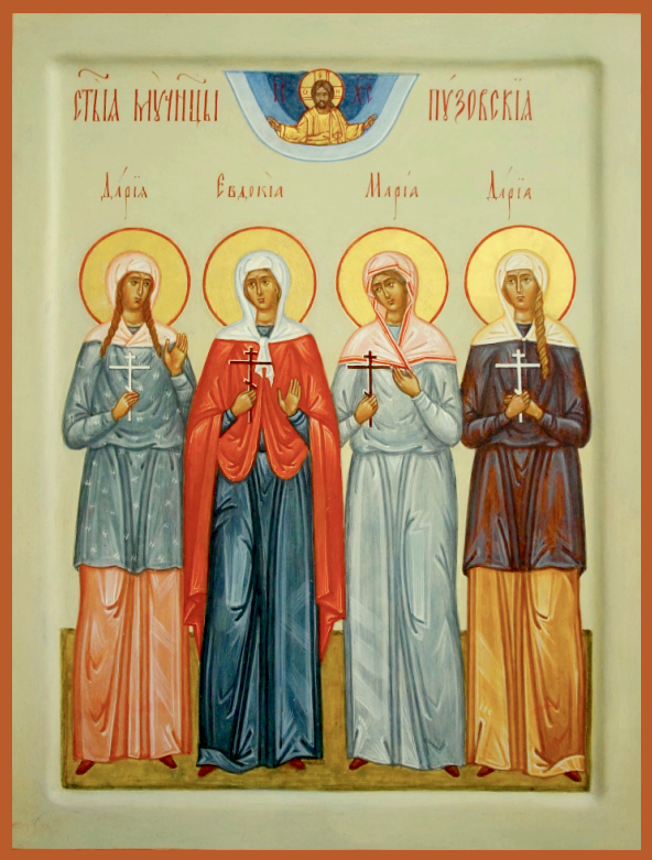 Пе́снь 1. Ирмо́с: Колесницегони́теля фарао́ня погрузи́ чудотворя́й иногда́ Моисе́йский же́зл, крестообра́зно порази́в и раздели́в мо́ре, Изра́иля же беглеца́, пешехо́дца спасе́, пе́снь Бо́гови воспева́юща. Духо́вный ли́к соста́вльше, ве́рнии, сла́вныя страстоте́рпицы, я́ко свети́льники Це́ркве, озаря́ющия сердца́, пе́сньми почти́м, ве́рою и любо́вию па́мять и́х соверша́юще. Восхва́лим дне́сь четвери́цу сла́вную: блаже́нную Евдоки́ю, Да́рию, ину́ю Да́рию и Мари́ю, подо́бниц дре́вним му́чеником по́двиги и страда́нии. В ле́та, в ня́же о́гнь любве́ ко Христу́ уга́сл е́сть, яви́стеся, му́ченицы до́блия. Моли́теся, да о́гнь Боже́ственныя любве́ согре́ет охладева́ющая сердца́ на́ша. Богоро́дичен: Пресвята́я Богоро́дице Де́во, Ты́ да́ры духо́вными от Пресвяты́я Тро́ицы па́че все́х челове́к преиспо́лнена еси́; те́мже, благода́тию Твое́ю укрепля́еми, умиле́нным се́рдцем ми́лости Твоя́ прославля́ем.