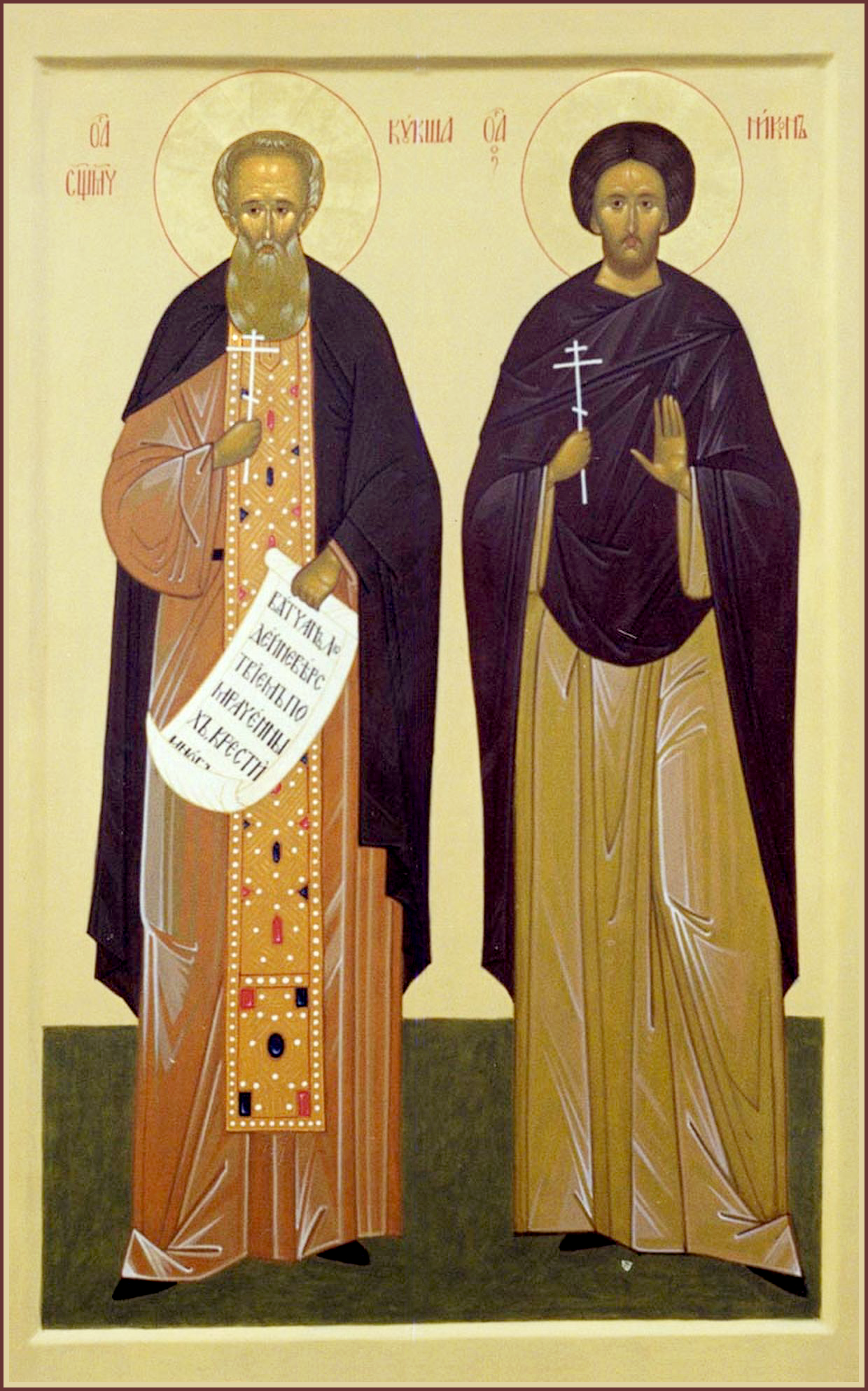 Пе́снь 1. Ирмо́с: Мо́ря чермну́ю пучи́ну невла́жными стопа́ми дре́вний пешеше́ствовав Изра́иль, крестообра́зныма Моисе́овыма рука́ма Амали́кову си́лу в пусты́ни победи́л е́сть. Восхвали́ти па́мять святы́х равноче́стно кто́ возмо́жет, честна́ бо сме́рть и́х пред Тобо́ю, я́ко друго́в Твои́х, Бо́же; оба́че а́з, ели́ко прия́х, хвалу́ и́м приношу́, и молю́ся Ти́, Влады́ко, препя́тия от мене́ отдали́в, си́лою Твое́ю укрепи́. Ку́кше свяще́нне со ученико́м Ни́коном, сосу́ди свяще́ннии су́ще, пронесо́сте И́мя Христо́во пред неве́рными, и́хже, зна́мении и чудесы́ уди́вльше, к богоразу́мию приведо́сте. Да бу́ду и а́з сосу́д в че́сть Влады́це моему́, моли́твами ва́шими мене́, отцы́, воспомози́те. Ва́с трие́х, Ку́кше со ученико́м Ни́коном, и Пи́мене прозорли́ве, дерза́я дне́сь хвала́ми почита́ти, молю́: предста́ните Тро́ице Святе́й, о мне́ моля́щеся, я́ко да трие́х враго́в: ми́ра, пло́ти и диа́вола, изба́влься, явлю́ся до́бр во́ин, си́х победи́в. Богоро́дичен: Изба́вльшая челове́ки от наси́лия вра́жия пречи́стым рождество́м Твои́м, от нечи́стых помышле́ний изба́ви мя́, молю́ся, и спаси́, я́ко Человеколюби́ваго Бо́га Ма́ти.
