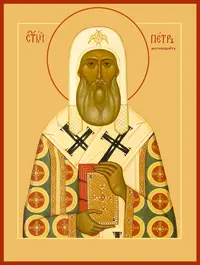 Конда́к, гла́с 4. Яви́ся дне́сь пресве́тлая па́мять твоя́, святи́телю преблаже́нне Пе́тре, в ми́ре све́тло сия́ющи и явля́ющи все́м Боже́ственное сия́ние. И́кос: Но́вый чудотво́рец яви́лся еси́, исцеле́ния подава́я все́м, усе́рдно от души́ приходя́щим: и Христо́вы лю́ди, Богоно́се, неви́димо посеща́я, зе́млю на́шу просвеща́еши, я́ко да согла́сно зове́м ти́ си́це: ра́дуйся, све́та безстра́стнаго до́ме; ра́дуйся, страсте́й те́мных прогони́телю; ра́дуйся, де́монския разруши́вый ко́зни; ра́дуйся, а́нгельския возвесели́вый чи́ны; ра́дуйся, высото́ Боговиде́ния чи́стаго; ра́дуйся, глубино́ смире́ния, боле́зни омыва́ющая; ра́дуйся, я́ко бы́л еси́ зри́тель неви́димых; ра́дуйся, я́ко сообщи́лся еси́ лико́м святи́телей; ра́дуйся, земли́ Росси́йския па́стырю и учи́телю; ра́дуйся, святи́телем изря́дная похвало́; ра́дуйся, его́же ра́ди показа́ Бо́г чудоде́йствия ве́лия; ра́дуйся, его́же ра́ди Бо́г сла́вится; ра́дуйся, утвержде́ние гра́ду на́шему.