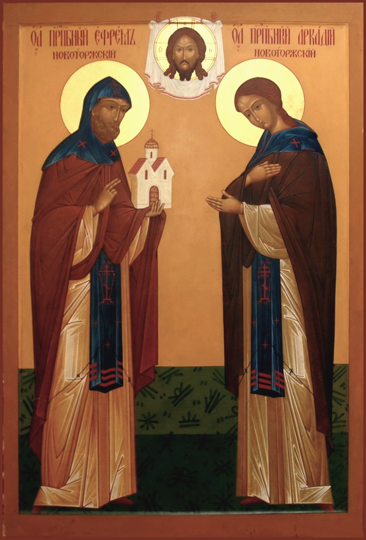 Свети́лен: Весели́теся, вси́ земни́и ро́ди, ра́дуйся, гра́де Торже́к, лику́йте, и́нок мно́жества, прииди́те, празднолю́бцы, я́ко да наслади́мся ны́нешняго торжества́, пе́сньми и хвала́ми почти́м ди́внаго и сла́внаго в чудесе́х преподо́бнаго Ефре́ма и любо́вно соверши́м па́мять его́, прося́ще: блаже́нне, помяни́ на́с, хва́лящих твою́ па́мять. Богоро́дичен: Ра́дуйся, ве́рным похвало́; ра́дуйся, преподо́бным утвержде́ние. Ра́дуйся, пра́ведным сла́во; ра́дуйся, све́те су́щим во тьме́. Ра́дуйся, хра́ме пресвяты́й; ра́дуйся, Бо́жий раю́. Ра́дуйся, кля́твы разреше́ние, Благослове́нная Мари́е. | |