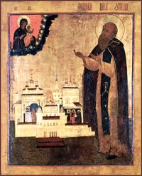 Пе́снь 7. Ирмо́с: Росода́тельну у́бо пе́щь соде́ла А́нгел преподо́бным отроко́м, халде́и же опаля́ющее веле́ние Бо́жие мучи́теля увеща́ вопи́ти: благослове́н еси́, Бо́же оте́ц на́ших. Пучи́ною сле́з твои́х, пребога́те, злонача́льнаго зми́я потопи́л еси́, и я́ко победоно́сец изря́ден к Небе́сным возне́слся еси́, и непреста́нно вопие́ши: благослове́н еси́, Бо́же оте́ц на́ших. Житие́ незло́биво име́л еси́, непоро́чно, укра́шено по́ты страда́ния, прехва́льне, и Боже́ственнаго светоли́тия испо́лнь, взыва́л еси́: благослове́н еси́, Бо́же оте́ц на́ших. Хва́лится, преподо́бне, гра́д тво́й, я́ко венце́м ца́рским обложи́ся, име́я мо́щи твоя́ в себе́, я́ко до́браго граждани́на от Бо́га прия́л е́сть. Богоро́дичен: Пресвята́я Де́во, Я́же Препе́таго Бо́га ро́ждшая, пою́щия Тя́ прича́стники покажи́ Све́та и изба́ви гее́нны, и огня́, и вся́каго вре́да вра́жия моли́твами Твои́ми.