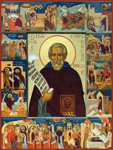 Память: 24 (11) апреля, 1 мая (18 апреля) Глас 8. Припев: Преподо́бне о́тче Иоа́нне, моли́ Бо́га о на́с. |