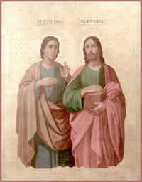 | Память: 14 (1) июля, 14 (1) июля Глас 4. Припев: Святи́и безсре́бреницы Космó и Дамиáне, моли́те Бо́га о на́с. |
