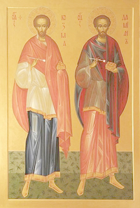 | Память: 14 (1) ноября, Глас 1. Припев: Святи́и безсре́бреницы Космó и Дамиáне, моли́те Бо́га о на́с. |
