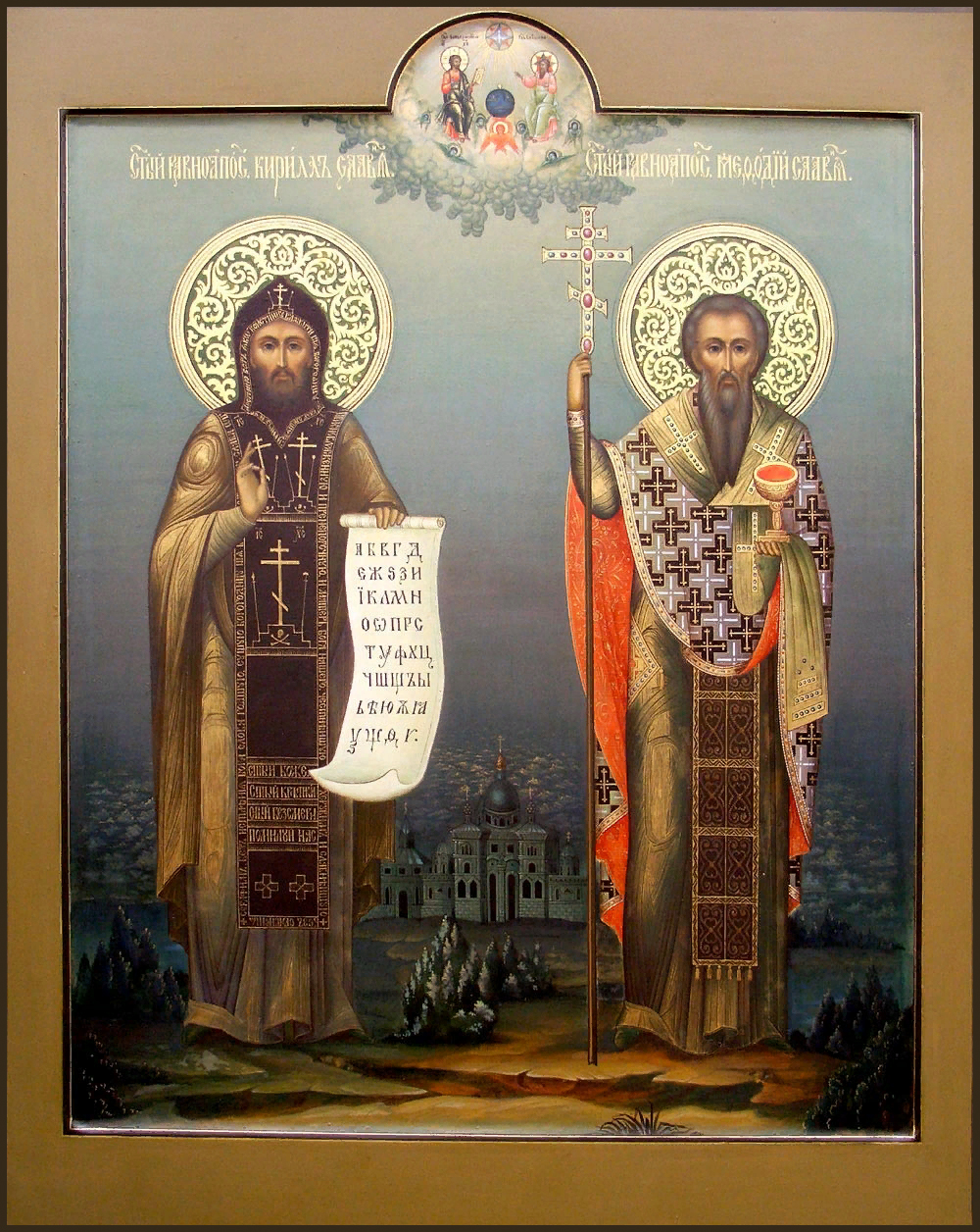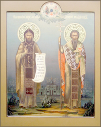 Память: 27 (14) февраля, 24 (11) мая, 19 (6) апреля, 24 (11) мая Глас 3. Припев: Святы́е равноапо́стольные отцы́ на́ши Кири́лле и Мефо́дие, моли́те Бо́га о на́с. |