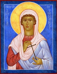 Пе́снь 9. Ирмо́с: Ка́мень нерукосе́чный от несеко́мыя горы́, Тебе́, Де́во, краеуго́льный отсече́ся — Христо́с, совокупи́вый разстоя́щаяся естества́. Те́м, веселя́щеся, Тя́, Богоро́дице, велича́ем. Ка́мению принося́щии че́сти па́че Зижди́теля, зре́ти тя́, сла́вная, не терпя́ще, Бо́гу возложену́, мече́м ссека́ют, сме́ртию боже́ственное безсме́ртие тебе́ обруча́юще. Фессалони́тский гра́д твои́ми пелена́ми и страда́ньми, му́ченице, хва́лится, де́во; Це́рковь же перворо́дных с пра́ведными и́мать тво́й ду́х боже́ственный, веселя́щийся. Лива́н, зла́то же и сми́рну в Вифлее́ме Рожде́нному волсви́ принесо́ша ве́рою, страстоте́рпица же кро́вь муче́ния излия́ние, о на́с Того́ моля́щи. Богоро́дичен: Же́зл прозябла́ еси́ из ко́рене Иессе́ева, Богороди́тельнице, цве́т Божества́, Христа́, на́м ро́ждши, Всечи́стая, дне́сь, Его́же, я́ко Бо́га Невмести́маго и ны́не я́ко Младе́нца, пелена́ми повива́ема, велича́ем. | |