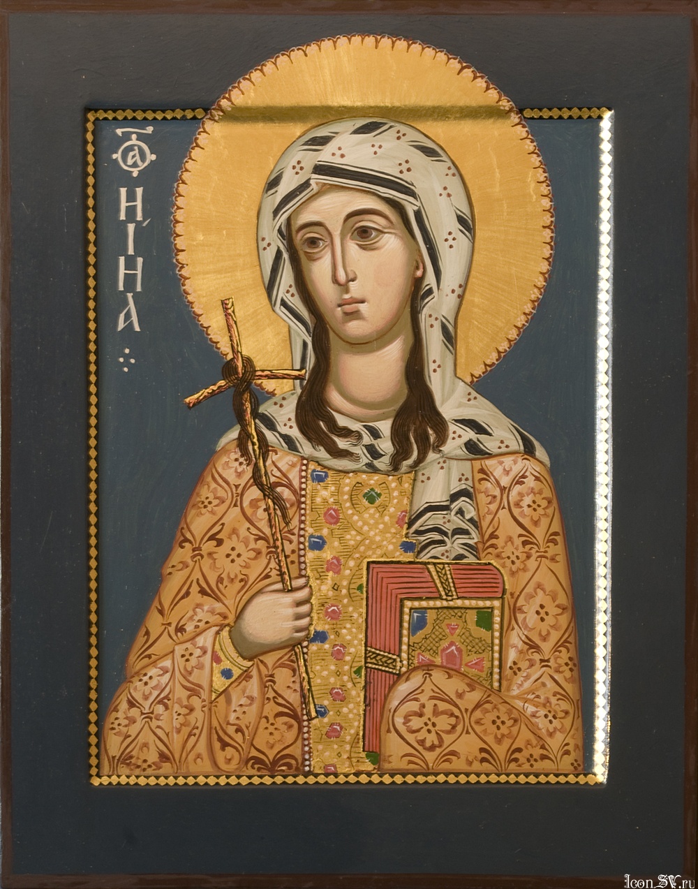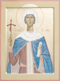 Конда́к, гла́с 2: Прииди́те дне́сь вси́, воспои́м избра́нную от Христа́ равноапо́стольную пропове́дницу Бо́жия сло́ва, му́друю благове́стницу, лю́ди Картали́нии приве́дшу на пу́ть живота́ и и́стины, Богома́тере учени́цу, усе́рдную засту́пницу и неусыпа́ющую храни́тельницу на́шу, Ни́ну прехва́льную. И́кос: В гу́слех духо́вных да восхва́лится му́драя пропове́дница, Иве́рии просвети́тельница, в купе́ли креще́ния избра́нными па́стырьми освяти́вшая лю́ди, жре́бием свиде́тельствованныя, равноапо́стольная, возлю́бленная раба́ Христо́ва, я́же де́сять за́поведей Бо́жиих прия́т, я́коже Моисе́й Богови́дец. Прииди́те у́бо, дне́сь ублажи́м пе́сньми усе́рдную засту́пницу и неусыпа́ющую храни́тельницу на́шу, Ни́ну прехва́льную.