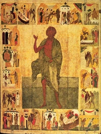 Пе́снь 9. Ирмо́с: Вся́к земноро́дный да взыгра́ется, Ду́хом просвеща́емь, да торжеству́ет же безпло́тных умо́в естество́, почита́ющее свяще́нное торжество́ Богома́тере, и да вопие́т: ра́дуйся, Всеблаже́нная Богоро́дице, Чи́стая Присноде́во. По Христо́ву словеси́ за бию́щия тя́ моли́лся еси́, свя́те: те́мже небе́сная врата́ отве́рзста и ду́ши пра́ведных во о́бразе ла́стовиц лета́ющия ви́дел еси́, с ни́миже ны́не водворя́ешися, Андре́е блаже́нне. Христа́ Бо́га и́стинно возлюби́в, тебе́ сама́го отве́рглся еси́ и Тому́ после́довал еси́, я́коже О́н рече́: любя́й ду́шу свою́ спасти́, погуби́т ю́. Те́мже ду́шу твою́ в жи́знь ве́чную соблю́л еси́, достохва́льне свя́те Андре́е. Вели́кая и пресла́вная ны́не сбы́шася тебе́ в небе́снем Ца́рствии, а́ще и юро́д бы́л еси́ ми́ру, но Христу́ му́др яви́лся еси́, достохва́льне: призира́й с небе́снаго кру́га на ны́, почита́ющия па́мять твою́. Богоро́дичен: Вся́к земноро́дный покрыва́ется Покро́вом Твои́м, пресла́вная Засту́пнице Богоро́дице, я́коже блаже́нный Андре́й Тя́ ви́де, за ми́р моля́щуюся Несозда́нному Существу́, в созда́нное естество́ от Тебе́ обле́кшемуся. | |