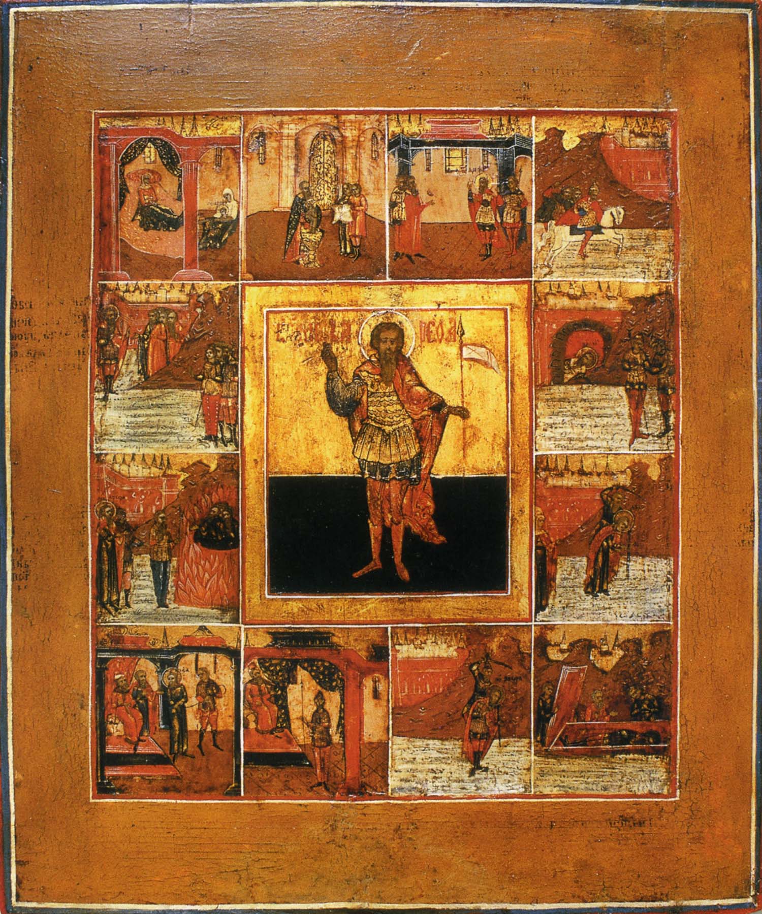Пе́снь 3. Ирмо́с: Небе́снаго кру́га Верхотво́рче, Го́споди, и Це́ркве Зижди́телю, Ты́ мене́ утверди́ в любви́ Твое́й, жела́ний кра́ю, ве́рных утвержде́ние, еди́не Человеколю́бче. Утвержде́нну зря́ще Креста́ благода́тию Твою́ Це́рковь, евре́йстии о́троцы пребеззако́ннии, за́вистию та́юще, и ра́нами многообра́зными неща́дно му́чаху, еди́не Человеколю́бче. Ядоме́тный язы́к злове́рнии иму́ще и Тя́ ху́ляще, си́х прароди́тели Изба́вльшаго дре́вняго мучи́тельства, в Тя́ ве́рующия, Спа́се, закла́ша. Созда́вый наедине́ богоде́йственным ма́нием челове́ческая сердца́, кто́ про́мысла Твоего́ глубину́ возмо́жет пости́гнути? Я́ко ста́до, е́же, Христе́, собра́л еси́, волко́м пре́дал еси́. Богому́дрое твое́ ста́до, ва́рварскими мечи́ ссека́емо, усе́рдно призыва́ше Тя́: приими́ ду́хи и ду́ши на́ша, Спа́се, и к све́ту наста́ви Ца́рствия Твоего́. Богоро́дичен: Умерщвле́на мя́ дре́вле, к жи́зни, Пречи́стая, па́ки возвела́ еси́, еди́на Ипоста́сную Жи́знь ро́ждшая, Е́йже прирази́вшися, расто́ржеся я́ве вражде́бнейшая сме́рть.