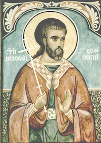 Конда́к, гла́с 2. Благоче́стия и́стиннаго побо́рника и в беда́х непобеди́маго помо́щника, Боже́ственнаго Никола́я в пе́снех восхва́лим: се́й бо яви́ся в после́дняя ле́та звезда́ пресве́тлая, просвеща́ющая ве́рных сердца́, и, со А́нгелы ны́не Тро́ице предстоя́, непреста́нно мо́лится о все́х на́с. И́кос: Свяще́нный соверша́ет Це́рковь дне́сь пра́здник, све́тло пропове́дающи до́блественныя боле́зни но́ваго му́ченика Никола́я и я́же па́че естества́ боре́ния, и́миже низложи́в многоко́зненнаго врага́, бы́сть сла́ва страда́льцев и похвала́, му́жества же сто́лп и свети́льник все́м, благоче́стно того́ чту́щим. Но я́ко пропове́дник и́стины и вене́чник, со А́нгелы ны́не Тро́ице предстоя́, непреста́нно мо́лится о все́х на́с.
