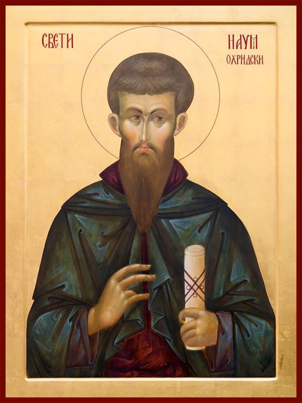 Пе́снь 4. Ирмо́с: Го́ру Тя́, благода́тию Бо́жиею приосене́нную, прозорли́выма Авваку́м усмотри́в очи́ма, из Тебе́ изы́ти Изра́илеву провозглаша́ше Свято́му, во спасе́ние на́ше и обновле́ние. Славе́нския ро́ды и за́падныя ва́с восхваля́ют, Нау́ме чу́дне с Кли́ментом па́стырем, ва́с бо ра́ди спасе́ние обрето́ша и и́дольскаго изба́вльшеся помраче́ния. Честна́ сме́рть твоя́ бы́сть, преподо́бне, пред Созда́телем и Содержи́телем вся́ческих, Нау́ме приснопа́мятне, живя́ бо, Тому́ угоди́л еси́, и по сме́рти то́чиши чудеса́. Ве́сь от ю́ности Бо́гу возложе́н, ве́сь прия́телище доброде́телей и де́латель Того́ повеле́ний бы́л еси́, Нау́ме блаже́нне, ве́сь и Свята́го Ду́ха испо́лнь яви́лся еси́ и свиде́тель Того́ чуде́с. Исто́чник боля́щим и злостра́ждущим тво́й гро́б, о́тче Нау́ме, точа́щий все́м бога́тно разли́чная исцеле́ния, неистощи́мый бо исто́чник показа́ся Боже́ственных чуде́с все́м, приходя́щим с ве́рою. Богоро́дичен: Сло́во О́тчее па́че сло́ва сло́вом вмести́ла еси́ Боголе́пно и Сего́ родила́ еси́ на́м, безслове́сия все́х, и́же от Ада́ма, избавля́ющаго, Его́же уми́лостиви, Де́во, рабо́м Твои́м.