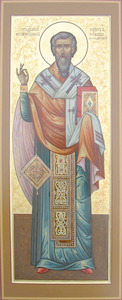 Пе́снь 4. Ирмо́с: Вознесе́на Тя́ ви́девши Це́рковь на Кресте́, Со́лнце пра́ведное, ста́ в чи́не свое́м, досто́йно взыва́ющи: сла́ва си́ле Твое́й, Го́споди. Всено́щными бде́нии и вседне́вными, о́тче Богому́дре, стоя́нии, пло́ти движе́ния вся́ увяди́л еси́ и, ра́дуяся, взыва́л еси́: сла́ва си́ле Твое́й, Го́споди. Повину́л еси́ непоко́рное пло́ти твоея́ душе́вными си́лами, Богому́дре, прия́л еси́ благода́ть, всеблаже́нне, отгоня́ти ду́хи и очища́ти неду́ги. Си́лою Боже́ственною укрепля́емь, святи́телю, де́монския полки́ победи́л еси́ вся́, побе́ды, я́ко тезоимени́т, вене́ц чуде́с от Венцеда́вца насле́дил еси́. Богоро́дичен: Украси́лася еси́ духо́вными красота́ми, Отцу́ Собезнача́льнаго Сло́ва заче́нши и пло́тию ро́ждши, Де́во Всенепоро́чная, Его́же о ми́ре моли́.