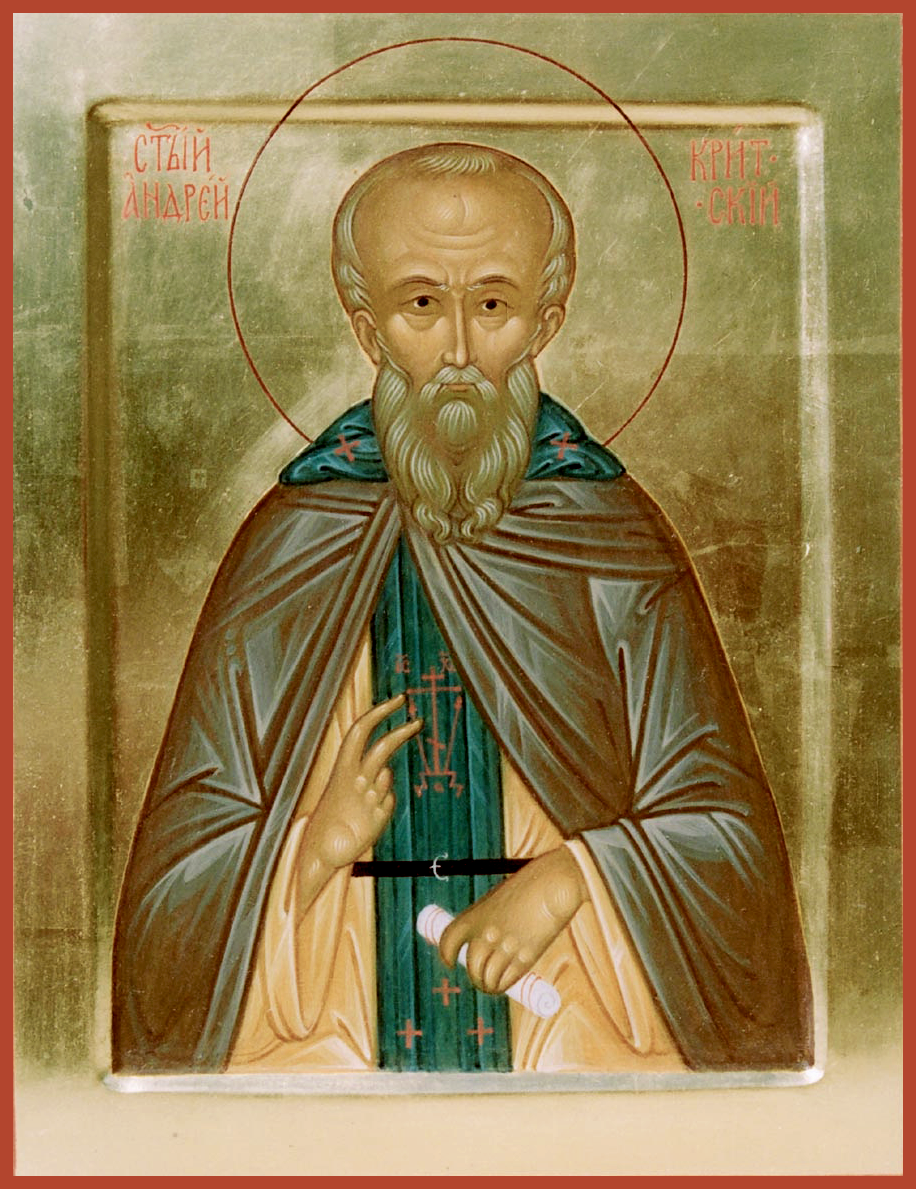Пе́снь 4. Ирмо́с: Прише́л еси́ от Де́вы не хода́тай, ни а́нгел, но Са́м Го́споди вопло́щся, и спа́сл еси́ всего́ мя челове́ка; те́м зову́ ти: сла́ва си́ле Твое́й, Го́споди. Послушли́в бы́в Христо́вых за́поведей, Того́ подо́бию, о́тче, че́стно поклоня́лся еси́. Те́м пребеззако́нный тя́ многообра́зными ра́нами умертви́. Миродохнове́н доброде́телей благово́нием бы́в, во гро́бе лежа́ благово́нствиши ли́ца призыва́ющих тя́ несомне́нным се́рдцем, о́тче преподо́бне. Неду́говавша Мамо́на всезле́йшаго, преподо́бне, окая́нно е́ресию, со дерзнове́нием обличи́л еси́, побо́рник бы́в правосла́вных, Андре́е досточу́дне. Богоро́дичен: Я́ко Благопло́дная возрасти́ла еси́ благода́тный Кла́с, пита́ющий вся́, правосла́вно почита́ющия Тя́, Влады́чице Всепе́тая, и из Тебе́ вопло́щшагося Сло́ва, Всечи́стая.