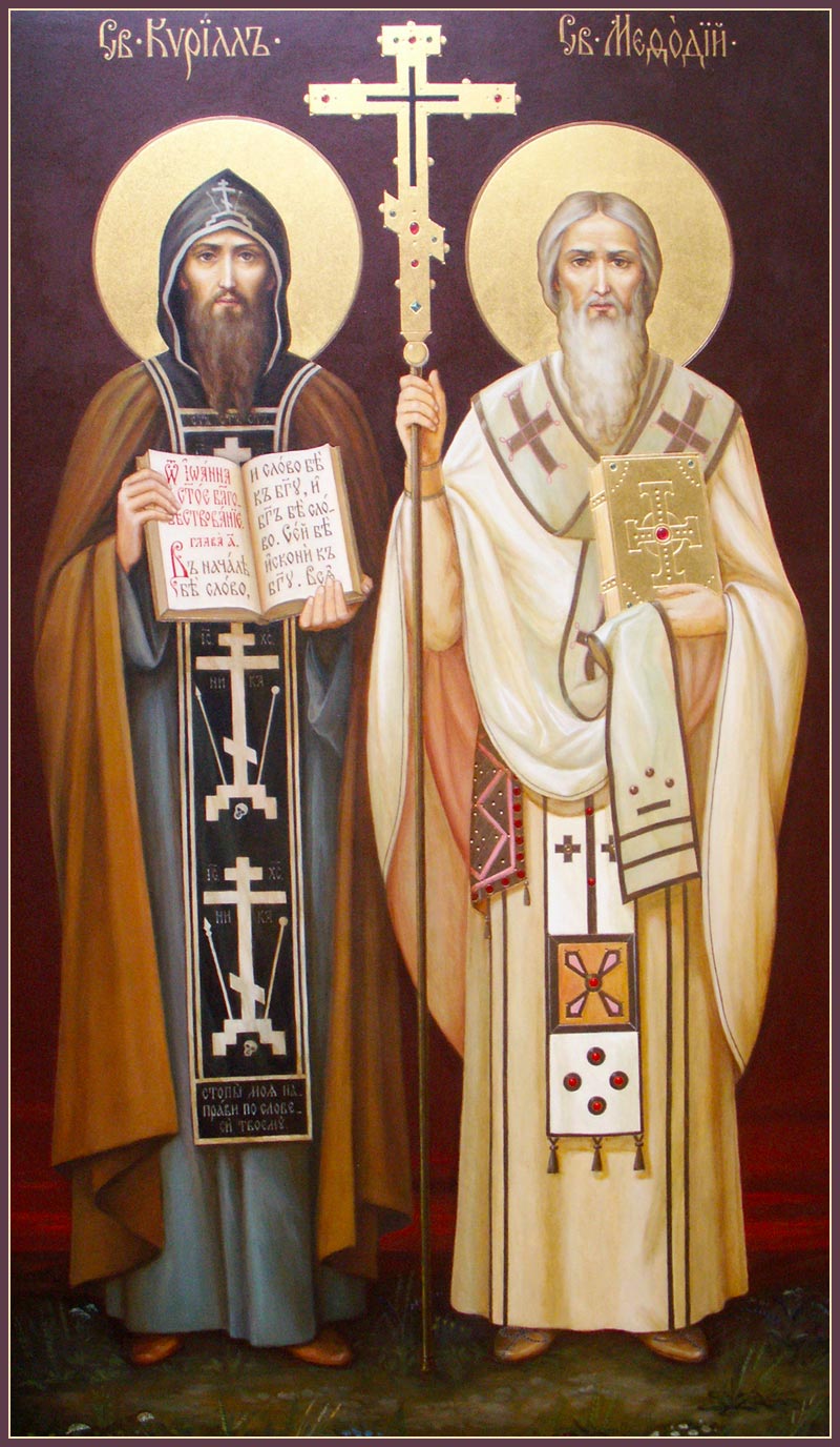 Пе́снь 7. Ирмо́с: О́бразу злато́му на по́ле Деи́ре служи́му, трие́ Твои́ о́троцы небрего́ша безбо́жнаго веле́ния, посреде́ же огня́ вве́ржени, ороша́еми, поя́ху: благослове́н еси́, Бо́же оте́ц на́ших. О ва́ю, свята́я, хва́лится сла́вно гра́д Солу́нский, Кири́лле свя́те и Мефо́дие, Ми́сия, и Панно́ния, и Мора́вская, блаже́ннии, земля́, сла́вящи и вопию́щи: благослове́н еси́, Бо́же оте́ц на́ших. На ка́мени ты́ ве́ры утверди́ но́зе свои́, блаже́нне, и не поколеба́ тебе́, свя́те, богопроти́вных духо́в си́ла, но, я́ко хра́брый боре́ц, проти́вяся и́м, поя́ше: благослове́н еси́, Бо́же оте́ц на́ших. Избоде́на мя́ разбо́йники, Христе́, и уя́звлена, поми́луй мя́, молю́ся Тебе́, и возле́й еле́й ми́лости Твоея́ на мя́, я́ко да восхвалю́ Тя́: Бо́же, благослове́н еси́. Богоро́дичен: Невеще́ственнаго Све́та селе́ние Твое́ чре́во бы́сть, светлостьми́ Бо́жия ра́зума безбо́жие отгна́вшее, Чи́стая Богоневе́сто Деви́це, е́же пое́м, вопию́ще: благослове́н еси́, Бо́же оте́ц на́ших.