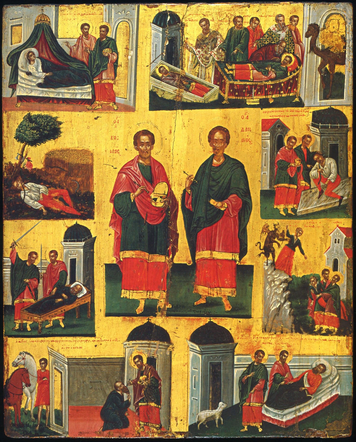 Память: 14 (1) ноября, Глас 6. Припев: Святи́и безсре́бреницы Космó и Дамиáне, моли́те Бо́га о на́с.