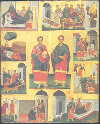 Седа́лен, гла́с 8. От исто́чника бе́здны, Иису́са, чуде́с струи́ благоле́пно поче́рпше, святи́и, та́йными ту́чами страсте́й мра́чныя о́блаки отгоня́ете и неду́гующим челове́ком исцеле́ния подае́те. Те́м, получи́вше здра́вое весе́лие, ва́ми, пресла́внии, удивля́еми, зове́м: богоно́снии безсре́бреницы, моли́те Христа́ Бо́га согреше́ний оставле́ние дарова́ти пра́зднующим любо́вию святу́ю па́мять ва́шу Богоро́дичен: Я́ко Всенепоро́чная Неве́сто Творца́, я́ко Неискусому́жная Ма́ти Изба́вителя, прия́телище я́ко су́щи Уте́шителя, Препе́тая, беззако́нию мя́ су́ща скве́рное оби́телище и бесо́м игра́лище в ра́зуме бы́вша, потщи́ся от те́х злоде́йства мя́ изба́вити и све́тлое жили́ще доброде́телей соверши́, Светоно́сная Нетле́нная, отжени́ о́блак страсте́й и вы́шняго прича́стия сподо́би и Све́та невече́рняго моли́твами Твои́ми. Крестобогоро́дичен: А́гнца, и Па́стыря, и Изба́вителя А́гница зря́щи на Кресте́, восклица́ше, пла́чущи, и, го́рько рыда́ющи, вопия́ше: ми́р у́бо ра́дуется, прие́мля Тобо́ю избавле́ние, утро́ба же Моя́ гори́т, зря́щи Твое́ распя́тие, е́же терпи́ши за милосе́рдие ми́лости. Долготерпели́ве Го́споди, ми́лости бе́здно и исто́чниче неисчерпа́емый, умилосе́рдися и да́руй согреше́ний оставле́ние ве́рою пою́щим Боже́ственныя стра́сти Твоя́.