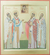 Седа́лен, гла́с 4. Святи́тельства и́стины Боже́ственным пома́занием и муче́ния свяще́нною и́стинно кро́вию просвеще́ни, сла́внии, совокупи́стеся чино́м, ра́дующеся, безпло́тных а́нгел. Те́м пра́зднуем честну́ю ва́шу па́мять, моля́щеся все́м очище́ние пода́ти моли́твами ва́шими, святи́и. Богоро́дичен: Обнови́ла еси́, Чи́стая, Боже́ственным рождество́м Твои́м истле́вшее во страсте́х земноро́дных ме́ртвенное существо́ и воздви́гла еси́ вся́ от сме́рти к животу́ нетле́ния. Те́мже Тя́ по до́лгу блажи́м вси́, Де́во Препросла́вленная, я́коже прорекла́ еси́. Крестобогоро́дичен: Де́во Пренепоро́чная, Ма́ти Христа́ Бо́га, ору́жие про́йде Твою́ пресвяту́ю ду́шу, егда́ распина́ема ви́дела еси́ во́лею Сы́на и Бо́га Твоего́. Его́же, Благослове́нная, моля́щи не преста́й проще́ние прегреше́ний на́м дарова́ти.
