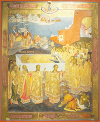 Свети́лен. Вели́ка чудеса́ твоя́, пресвяты́й Нико́лае, я́ко яви́лся еси́ во сне́ богому́дрому Константи́ну и три́ во́ины спа́сл еси́, без вины́ на сме́рть осужде́нныя. Та́ко и на́с спаси́ от напра́сныя и ве́чныя сме́рти, пресвяты́й Нико́лае, святи́телю Госпо́день. | |