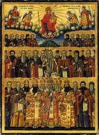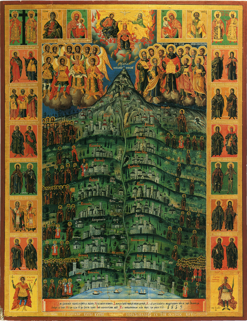 Свети́лен. Ра́дуйся, Горо́ Афо́нская сла́вная, моли́твенники твоя́ иму́щи просия́вшия в тебе́ Богоно́сныя отцы́: дне́сь пра́здник ра́достен с насе́льники твои́ми сотво́рши, почита́й собо́р и́х. Сла́ва, и ны́не: Ра́дуйся, Присноде́во, прорече́ние Твое́ ви́дящи испо́лнено, я́ко Гора́ сия́ свята́ бу́дет, и́бо подвиза́вшиися в не́й отцы́, и́хже дне́сь почита́ем, яви́шася вои́стинну свя́ти, де́лом запечатле́вше проро́чество Твое́, Отрокови́це. | |