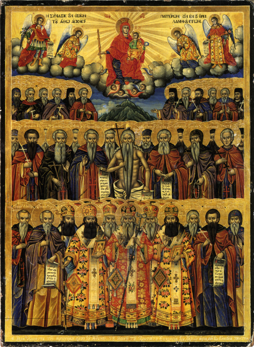 Конда́к, гла́с 4. Онебеси́вшия Го́ру сию́, и показа́вшия в не́й житие́ а́нгельское, и мно́жество мона́хов собра́вшия отцы́, прииди́те, благохва́лим вси́, к ни́м взыва́юще: вся́кия беды́ и искуше́ния на́с изба́вите, мно́жество преподо́бных, Афо́нская похвало́. И́кос: О, ко́ль добро́ соедине́ние ва́ше, отцы́ Богому́дрии! О, ко́ль красе́н и сла́док о́бщий се́й ва́ш пра́здник, в не́мже вси́ вы́, в Горе́ се́й просия́вшии святи́и, зна́емии ку́пно и безъиме́ннии, о́бщее хвале́ние, я́коже духо́вная бра́тия, прие́млете! Подоба́ше бо во еди́нем ме́сте Го́сподеви угоди́вшим во еди́н де́нь и пра́здновати. Сего́ ра́ди и мы́, и́же во Афо́не мона́си и мирсти́и, во еди́но собра́вшеся, по до́лгу ва́с ублажа́ем, но́вии– дре́вних и сы́нове– отце́в, согла́сно вопию́ще: ме́сто сие́, в не́мже пожи́сте, от вся́каго зла́ спаса́йте, мно́жество преподо́бных, Афо́нская похвало́.