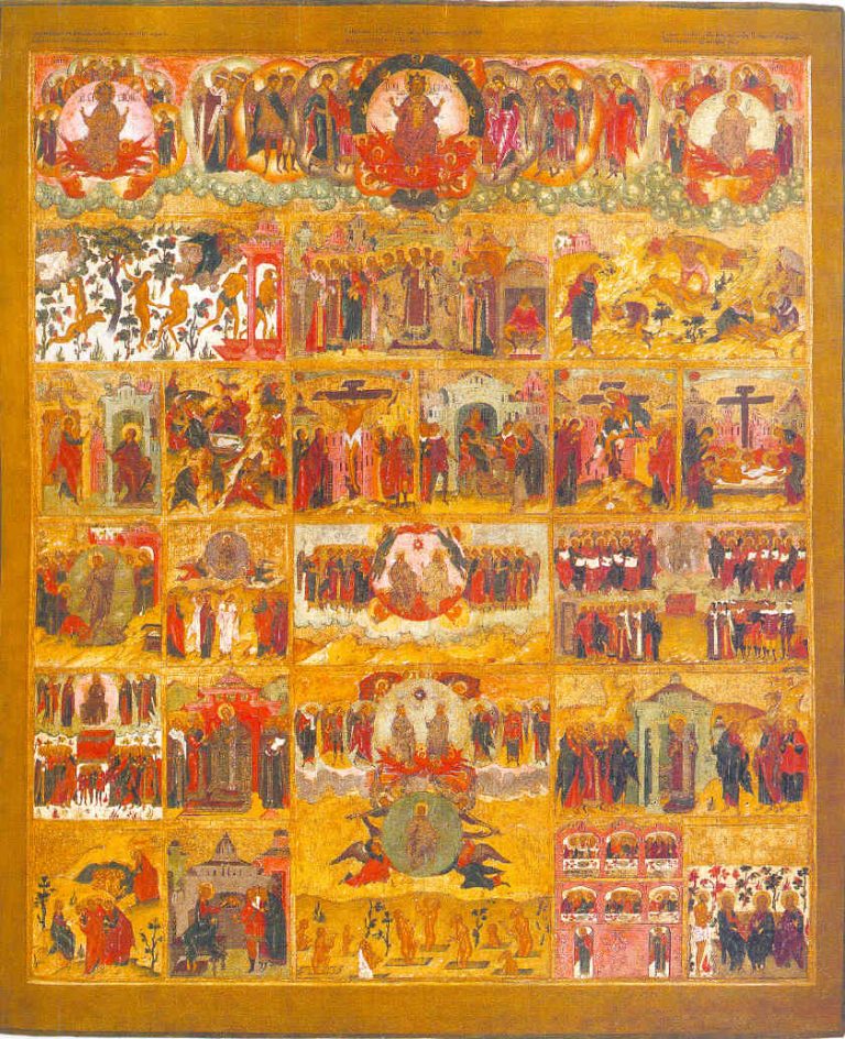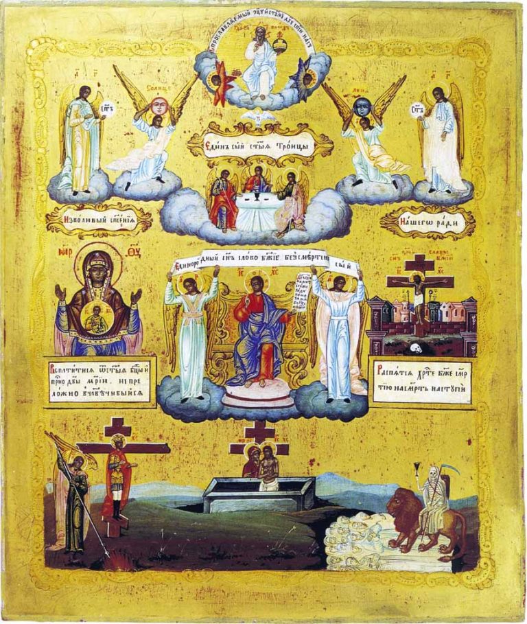Плоды Страданий Христовых Сюжет «Плоды страданий Христовых» получил наиболее широкое распространение в иконописи и фресковых росписях конца XVII — первой трети XIX века. Икона посвящена прославлению крестной Жертвы Христа и раскрытию ее значения для мира.